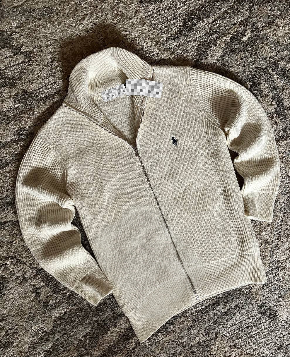 The sweater features a full zip closure and is made from a thicker, textured knit.