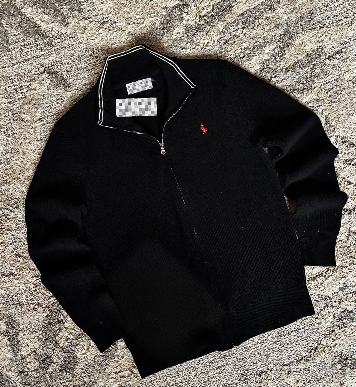The sweater features a full zip closure and is made from a thicker, textured knit.